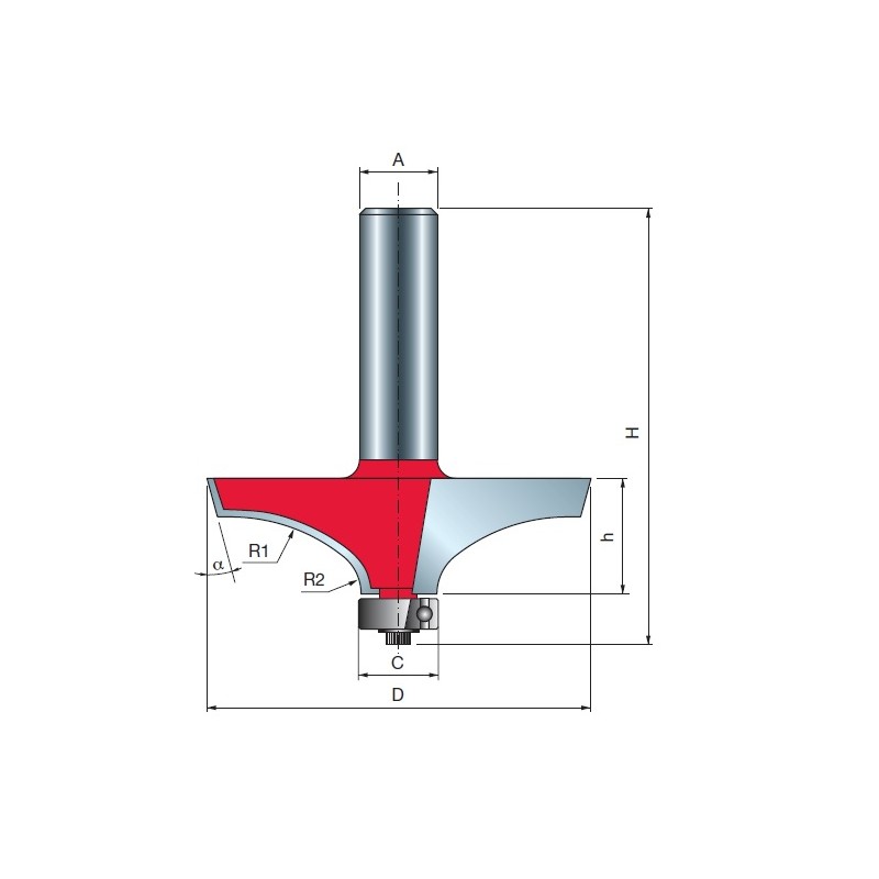 A-priemer stopky, D-priemer pracovný, h-výška pracovná, H-výška celková, α<-uhol rezu, ᴓC-priemer ložiska, R1-polomer, R2-polomer,